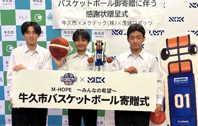 メクテックは、1971年に茨城県内に生産拠点を設立し、現在は国内では唯一の生産拠点を牛久市に構えています。半世紀以上にわたる企業活動を通じて、同県での地域貢献活動にも注力しています。こうした背景から、茨城県水戸市をホームタウンとして、「スポーツ・エンターテインメント・メディアにより夢・誇り・活力を生み出し、プロスポーツを中心とする様々な事業を通じて、地方創生のさきがけモデルをつくる」ことをミッションに掲げる茨城ロボッツの活動に共感し、2024-25シーズンのブロンズスポンサー契約を締結しました。今回、同チームによる地域の未来のための活動「M-HOPE~みんなの希望~」*1の一環として、オリジナルバスケットボールを牛久市内の全中学校6校に寄贈することを決定しました。
